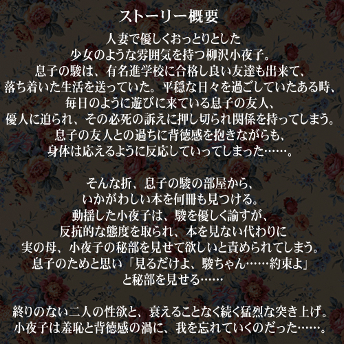 (やなぎさわ さよこ) B96・W59・H94 専業主婦で、一人息子の駿を大切に育ててきた。 おやつに手作りのクッキーを焼き、教育にも熱心に取り組み、 無事駿を有名進学校にも入れる。 今は、子育ても一段落ついたように、穏やかな日々を過ごしていた。 夫は単身赴任中。 CV 志方馨